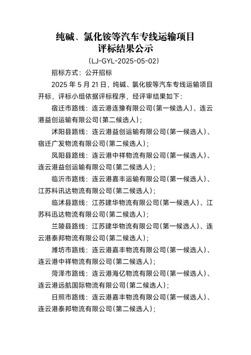 連云港連堿供應鏈有限公司純堿、氯化銨等汽車專線運輸項目評標結(jié)果公示