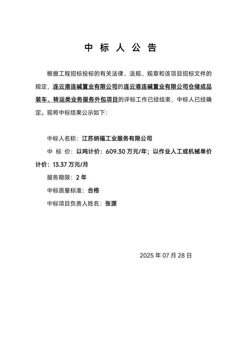 連云港連堿置業(yè)有限公司倉儲成品裝車、轉(zhuǎn)運類業(yè)務(wù)服務(wù)外包項目中標人公告