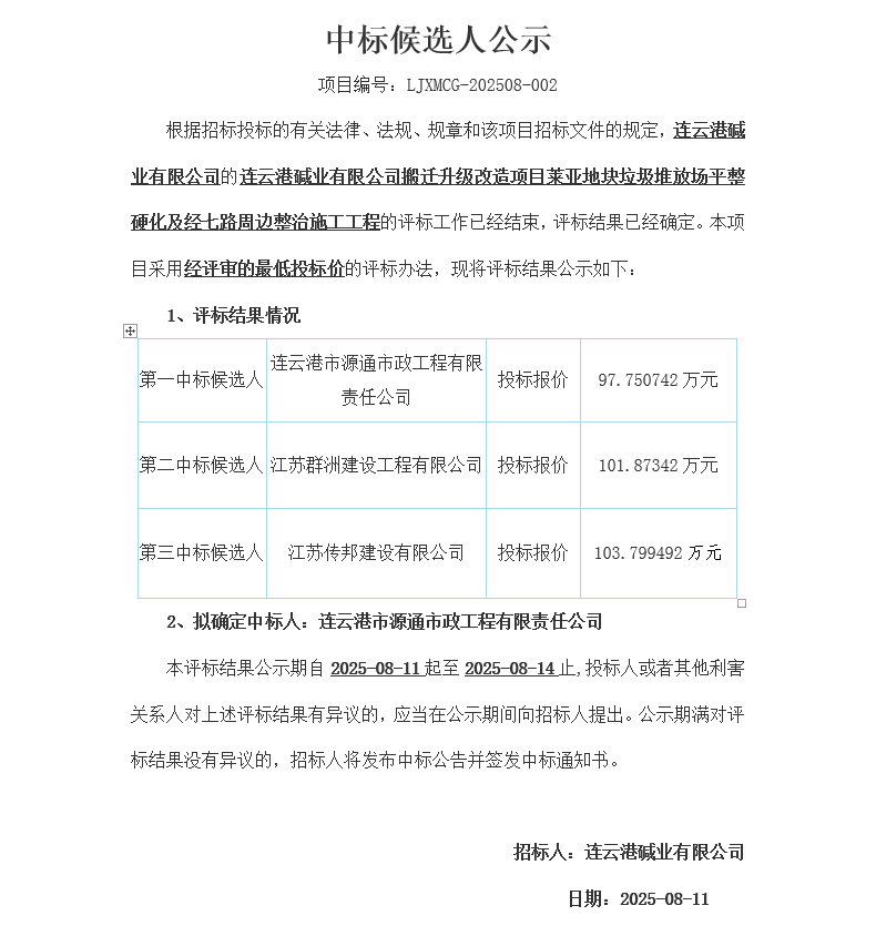 搬遷升級改造項(xiàng)目萊亞地塊垃圾堆放場平整硬化及經(jīng)七路周邊整治施工工程中標(biāo)候選人公示