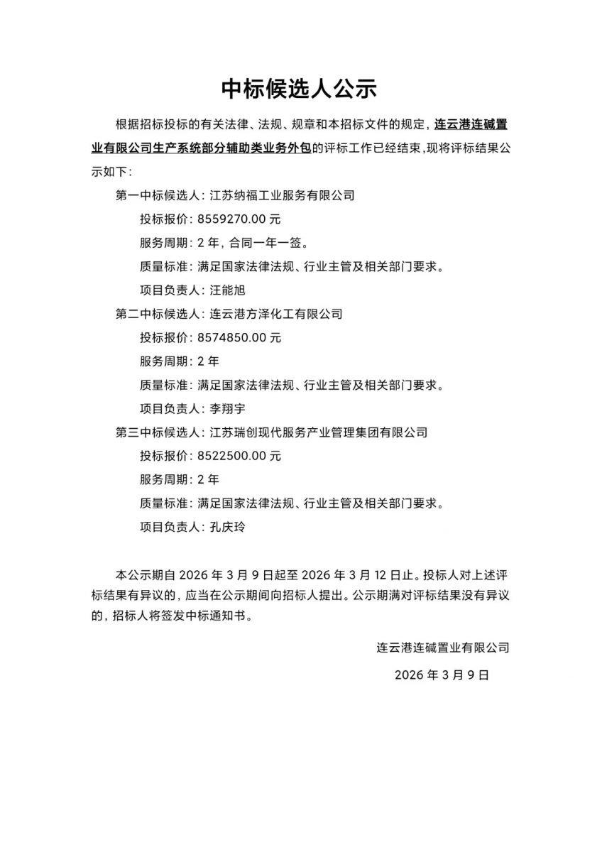 連云港連堿置業(yè)有限公司生產(chǎn)系統(tǒng)部分輔助類業(yè)務(wù)外包中標候選人公示