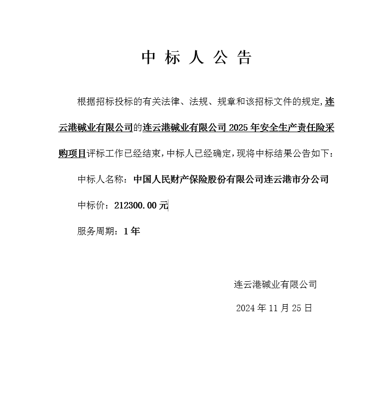 連云港堿業(yè)有限公司2025年安全生產(chǎn)責(zé)任險(xiǎn)采購項(xiàng)目中標(biāo)人公告