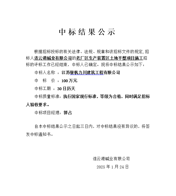 老廠區(qū)生產(chǎn)裝置區(qū)土地平整項(xiàng)目施工中標(biāo)結(jié)果公示