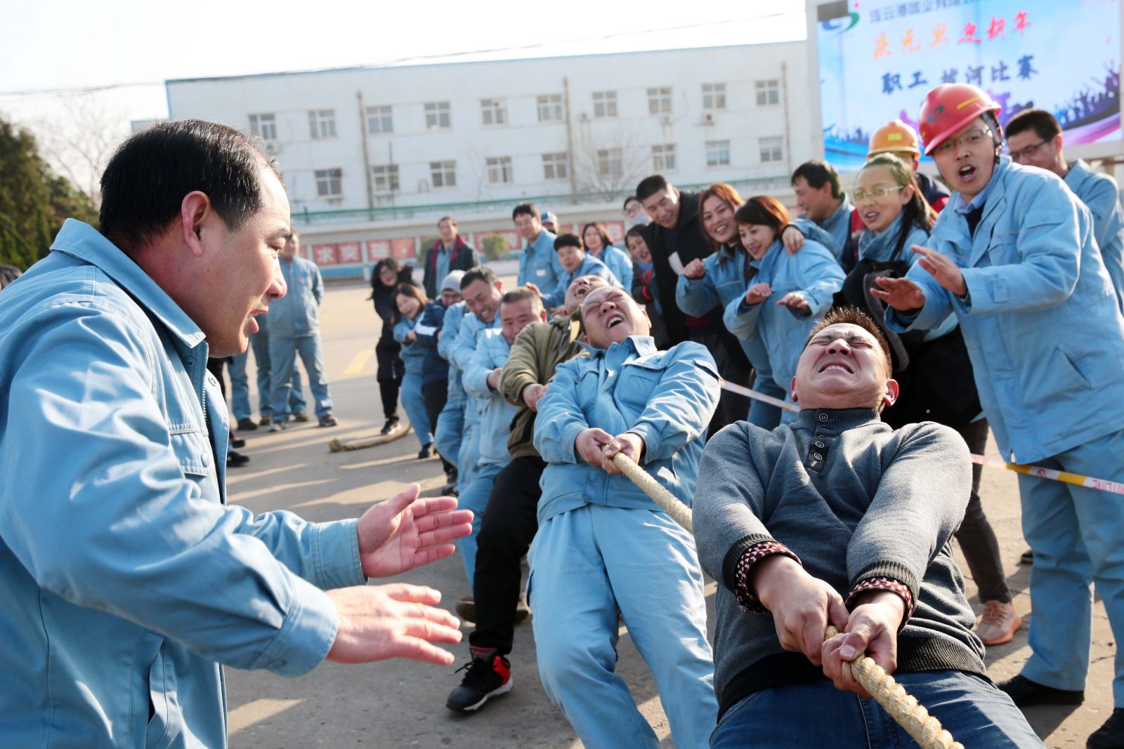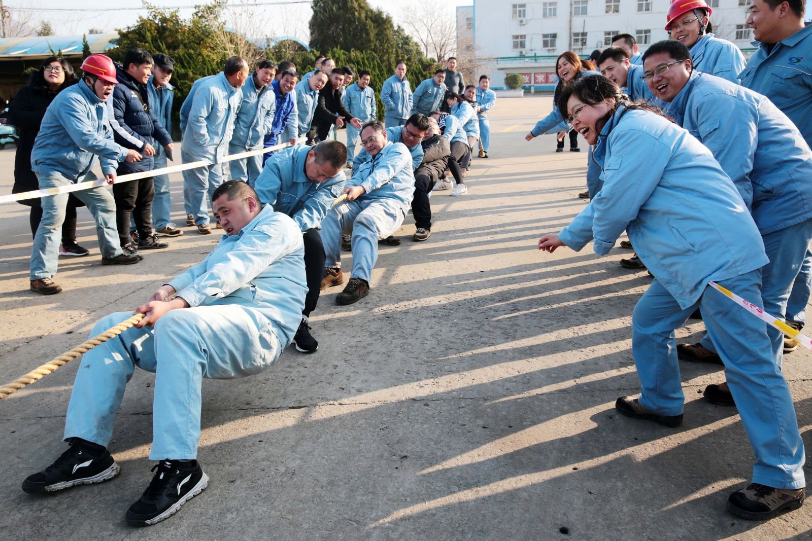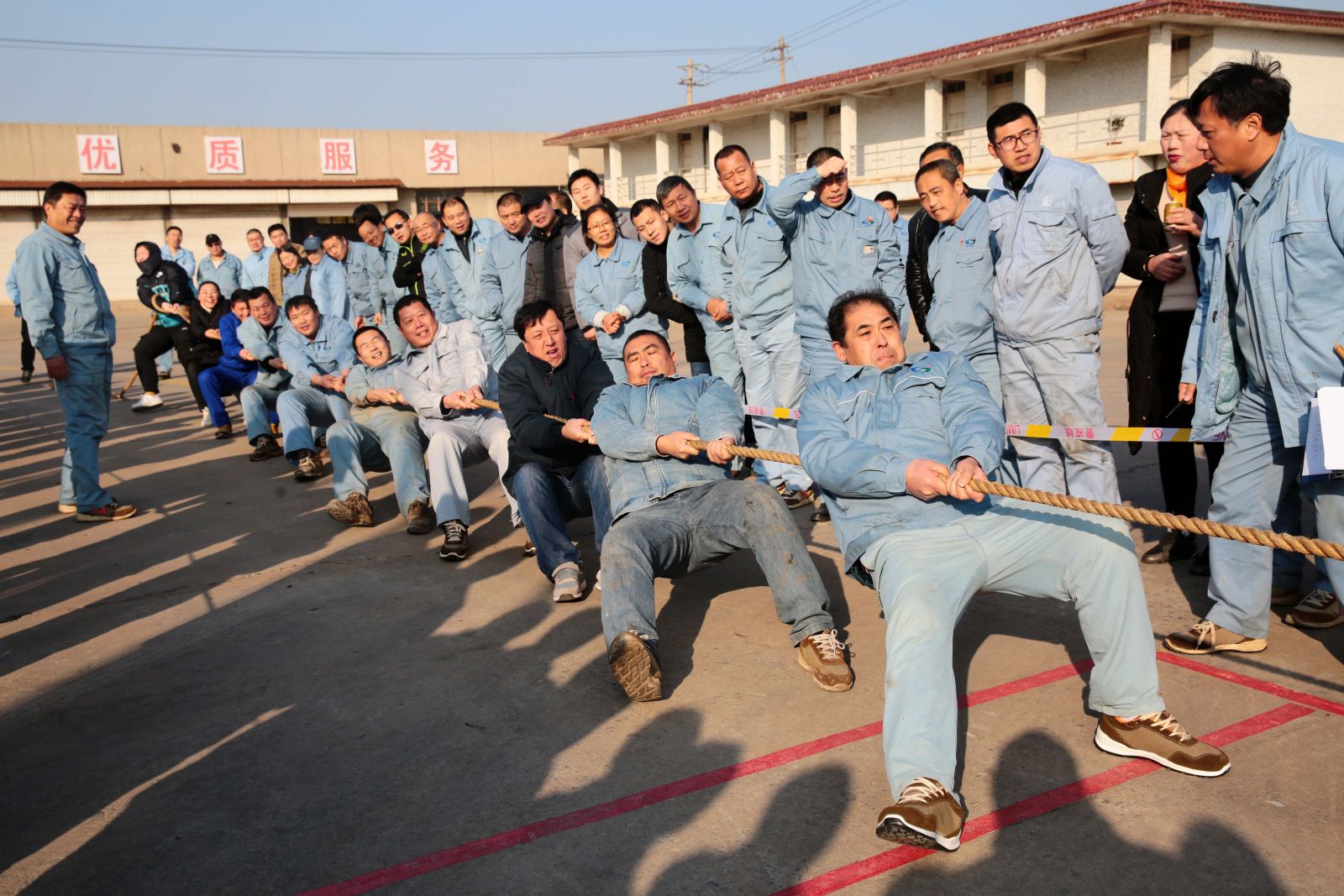 隨著裁判的一聲哨響,各名選手緊握繩索,咬緊牙關,一觸即發(fā),彎腰、下蹲、跨步,后仰、發(fā)力,整個動作整齊劃一,一氣呵成。未參賽的員工自發(fā)組成啦啦隊為比賽隊員助威,加油聲、吶喊聲、喝彩聲,此起彼伏,飄蕩在公司上空。