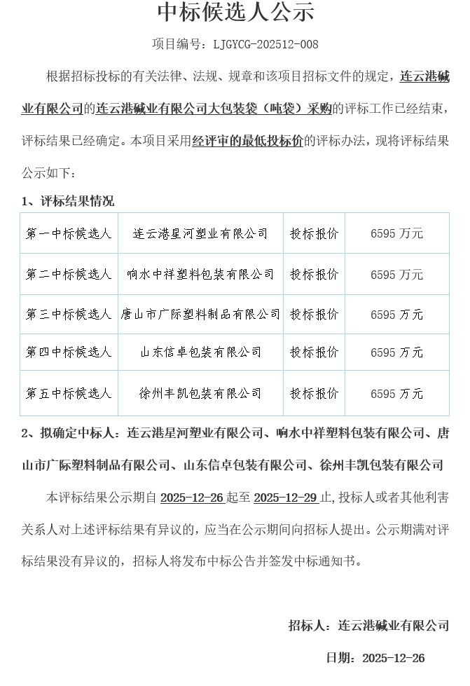 連云港堿業(yè)有限公司的連云港堿業(yè)有限公司大包裝袋(噸袋)采購中標(biāo)候選人公示