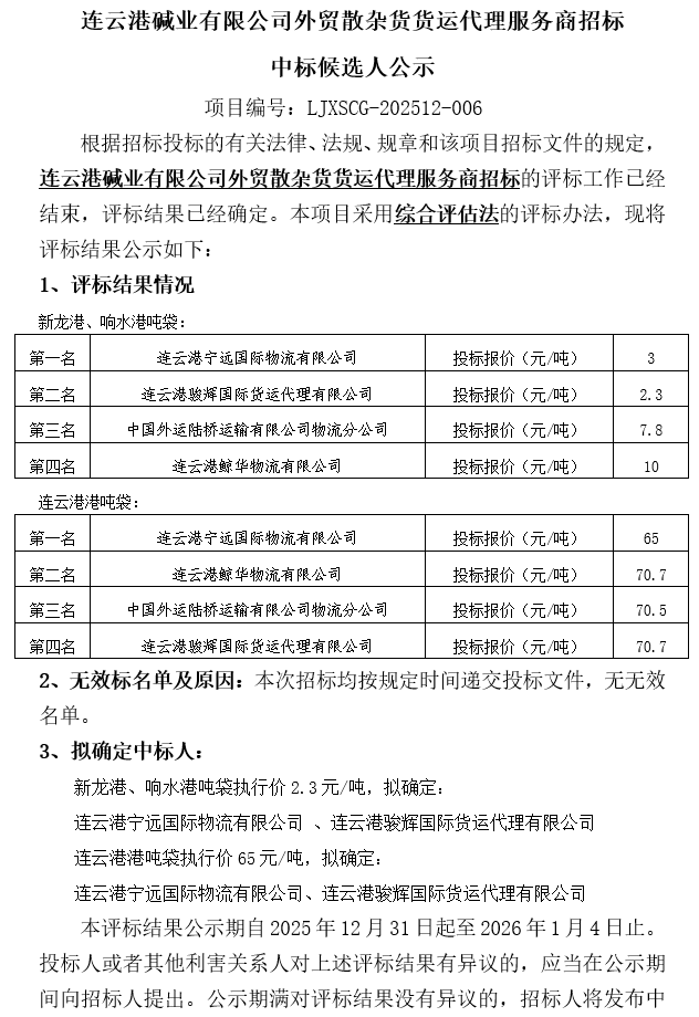 連云港堿業(yè)有限公司外貿(mào)散雜貨貨運(yùn)代理服務(wù)商招標(biāo)中標(biāo)候選人公示