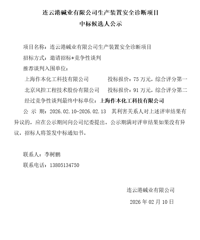 連云港堿業(yè)有限公司生產裝置安全診斷項目中標候選人公示