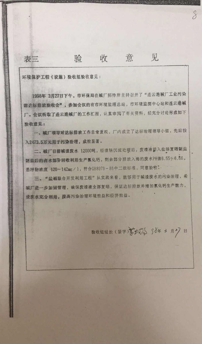 根據(jù)吉林化學(xué)工業(yè)公司設(shè)計(jì)院《連云港堿廠環(huán)境影響報(bào)告書(shū)》和原江蘇省環(huán)境保護(hù)局《關(guān)于對(duì)連云港堿廠環(huán)境影響報(bào)告書(shū)的批復(fù)》(蘇環(huán)管〔86〕31號(hào))的要求,連云港堿廠產(chǎn)生的廢液送至渣場(chǎng),經(jīng)澄清后,上清液經(jīng)自有排口閘直接排海。1997年,根據(jù)淮河流域水污染防治的要求,連云港市環(huán)保局向連云港堿廠下達(dá)了《關(guān)于淮河流域水污染源限期達(dá)標(biāo)排放的決定》(連環(huán)管〔1997〕16號(hào))。據(jù)此,連云港堿廠與臺(tái)北鹽場(chǎng)合作開(kāi)發(fā)了“堿渣場(chǎng)上清液回收利用工程”項(xiàng)目,利用上清液制鹽、制鈣。1998年3月27日,該項(xiàng)目通過(guò)連云港市環(huán)保局組織的環(huán)保驗(yàn)收,正式運(yùn)行。