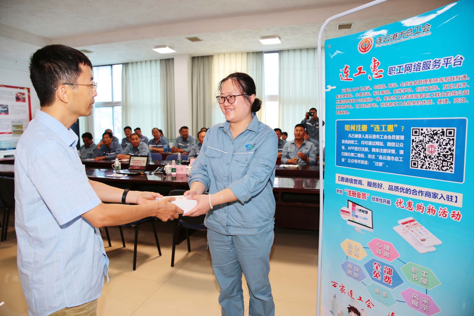 此次調(diào)研,孫月春副主席一行帶來三百余冊圖書贈予公司職工書屋,進一步豐富了公司職工的業(yè)余文化生活,并向參加連工惠抽獎活動獲獎的我公司職工伏廣偉頒獎。連工惠運營人員針對“連工惠”平臺注冊相關(guān)事宜進行了面對面指導,并一一解答了現(xiàn)場參會人員提出的問題。