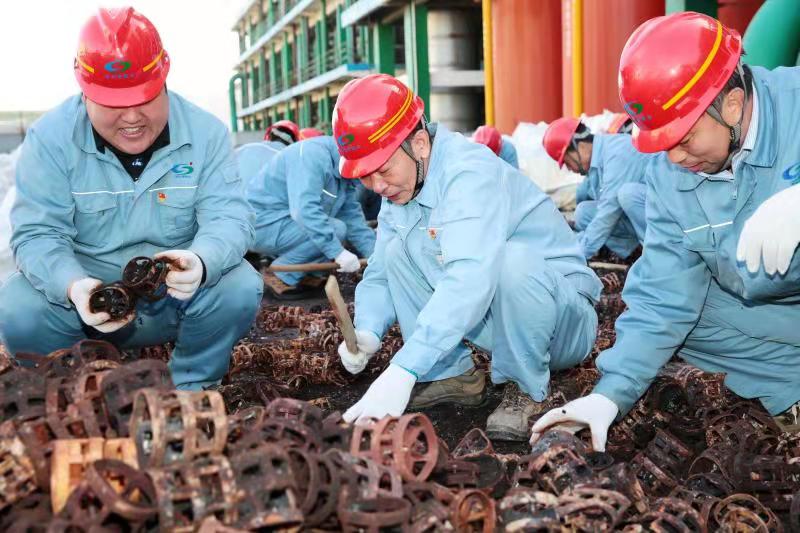 由于清理工作全靠人力完成,崗位人員一邊要維持生產(chǎn),一邊要清理填料,工作量非常大。11月12日下午,公司黨委書記、董事長張衛(wèi)民在調(diào)研重堿車間生產(chǎn)現(xiàn)場時了解到這一情況后,當(dāng)機(jī)立斷,立即組織公司領(lǐng)導(dǎo)及各部門黨員干部義務(wù)勞動,協(xié)助重堿車間完成鮑爾環(huán)填料清理回收工作。