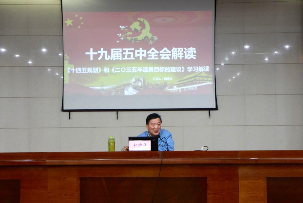 會上,鈕維社從“十九屆五中全會簡介”、“全會召開的背景和意義”、“回眸與展望”、“二0三五年遠(yuǎn)景目標(biāo)”、“十四五規(guī)劃”五個方面,結(jié)合具體事例,用通俗易懂的語言進(jìn)行了全面準(zhǔn)確的闡述,對我們認(rèn)真領(lǐng)會、準(zhǔn)確把握十九屆五中全會精神實(shí)質(zhì)具有十分重要的意義。