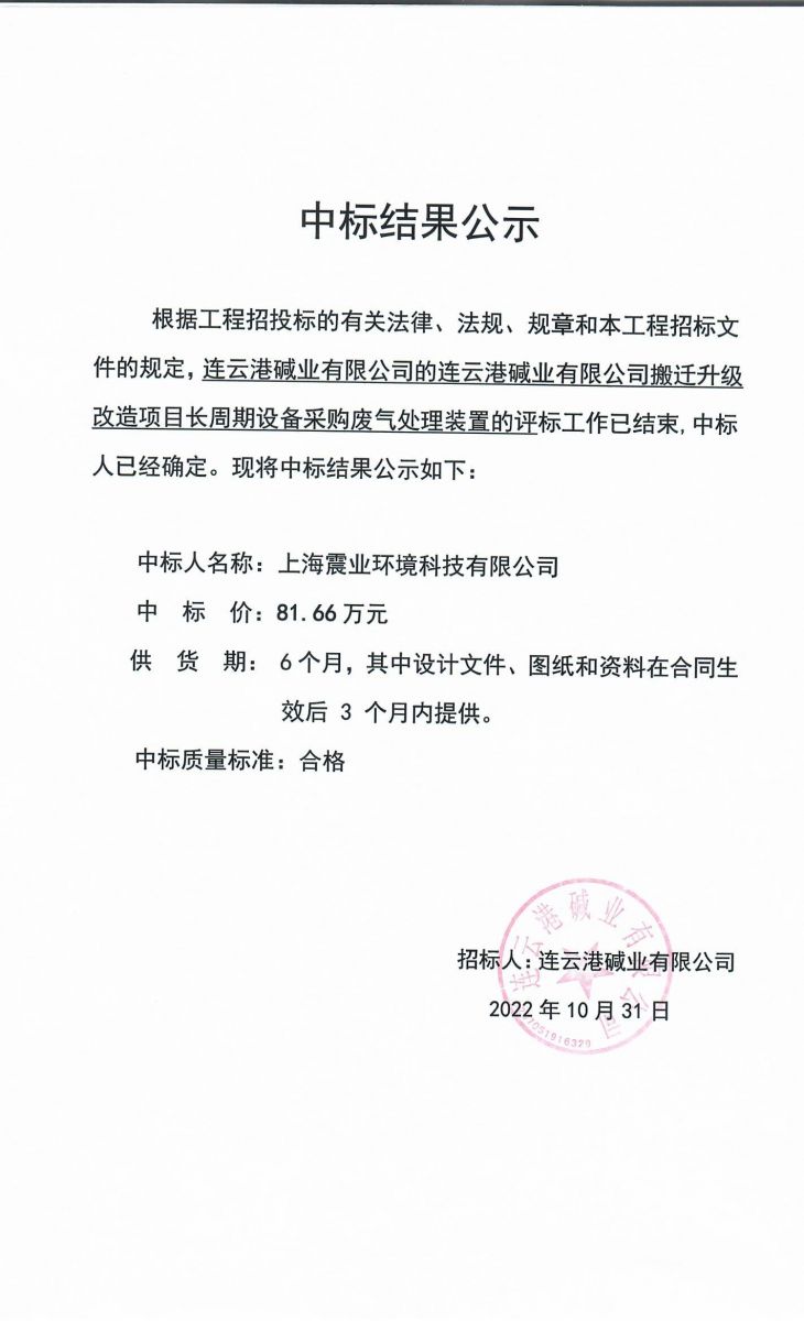 廢氣處理裝置中標(biāo)結(jié)果公示