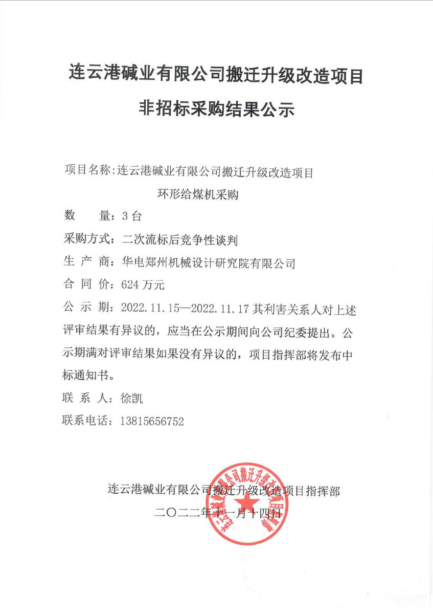 環(huán)形給煤機(jī)非招標(biāo)采購結(jié)果公示
