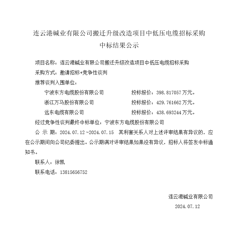 中低壓電纜中標(biāo)招標(biāo)采購中標(biāo)結(jié)果公示