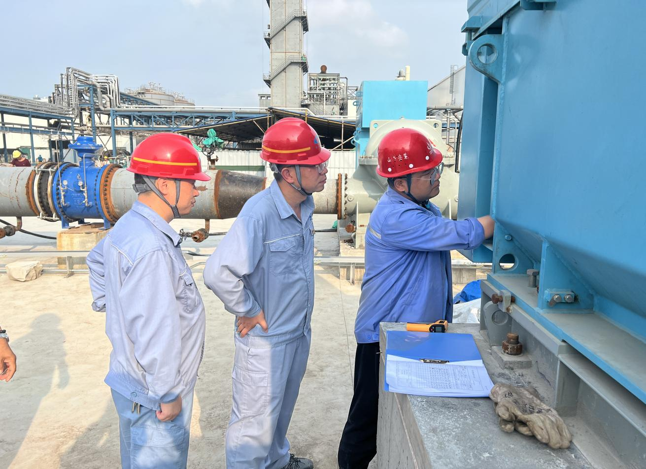 上午11:28,伴隨著“具備條件,啟動(dòng)電機(jī)”指令的發(fā)出,操作人員按下空分循環(huán)水泵P820101A“啟動(dòng)”開(kāi)關(guān),電機(jī)開(kāi)始高速旋轉(zhuǎn),隨后操作人員依次開(kāi)啟P820101B、C??辗盅h(huán)水泵單機(jī)試車(chē)的現(xiàn)場(chǎng)“熱辣滾燙”,大家衣衫被汗水濕透,但熱情依舊高漲。操作人員每隔15分鐘就詳細(xì)檢查記錄電機(jī)的軸溫、轉(zhuǎn)速、振值等指標(biāo)。